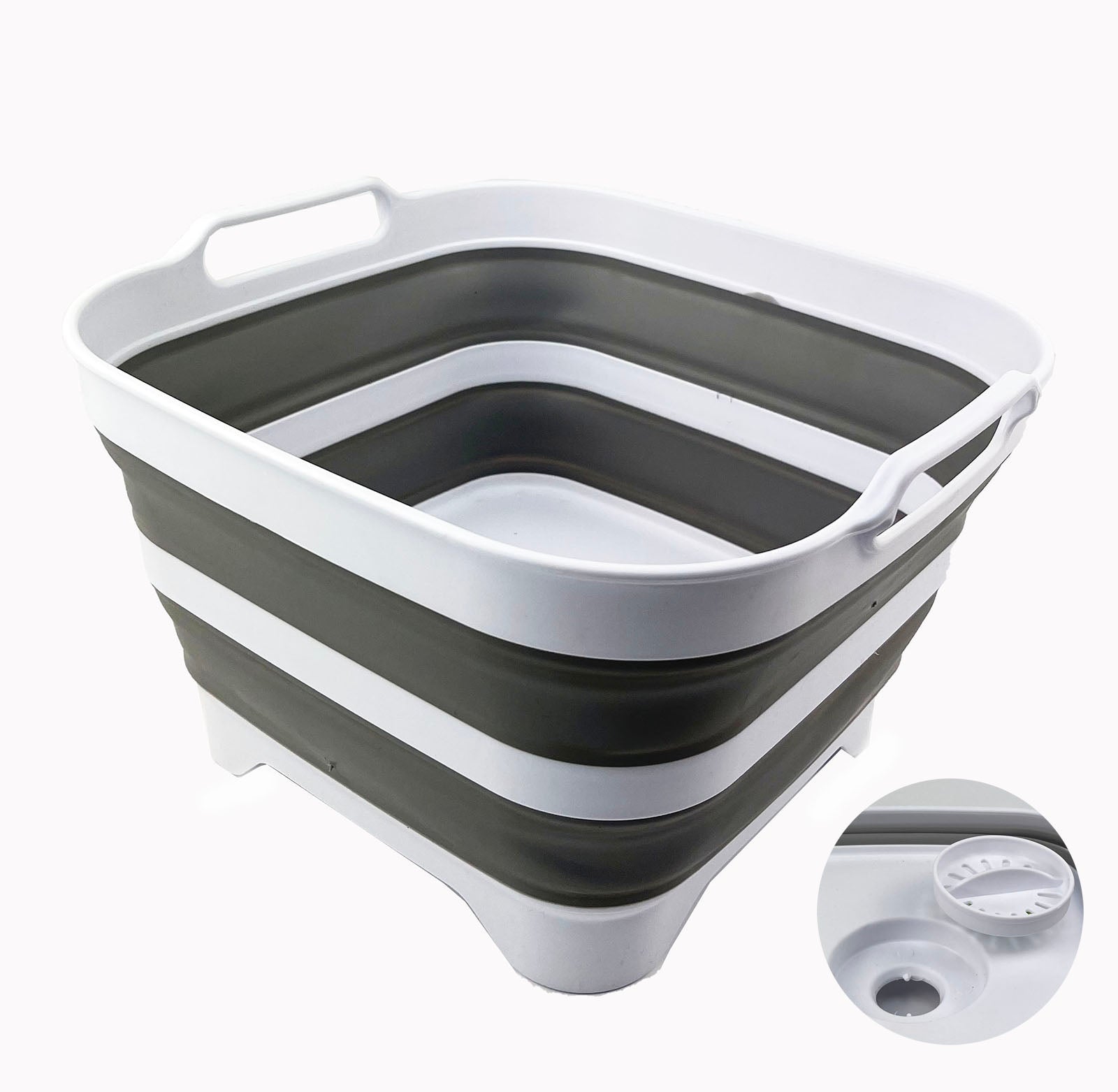 Details: **Collapsible Dishpan with Draining Plug **Brand: SAMMART **Material: TPE & PP **Expanded size: 13.19 x 12.8 x 8.25(h) inches **Collapsed size: 13.19 x 12.8 x 2.75(h) inches