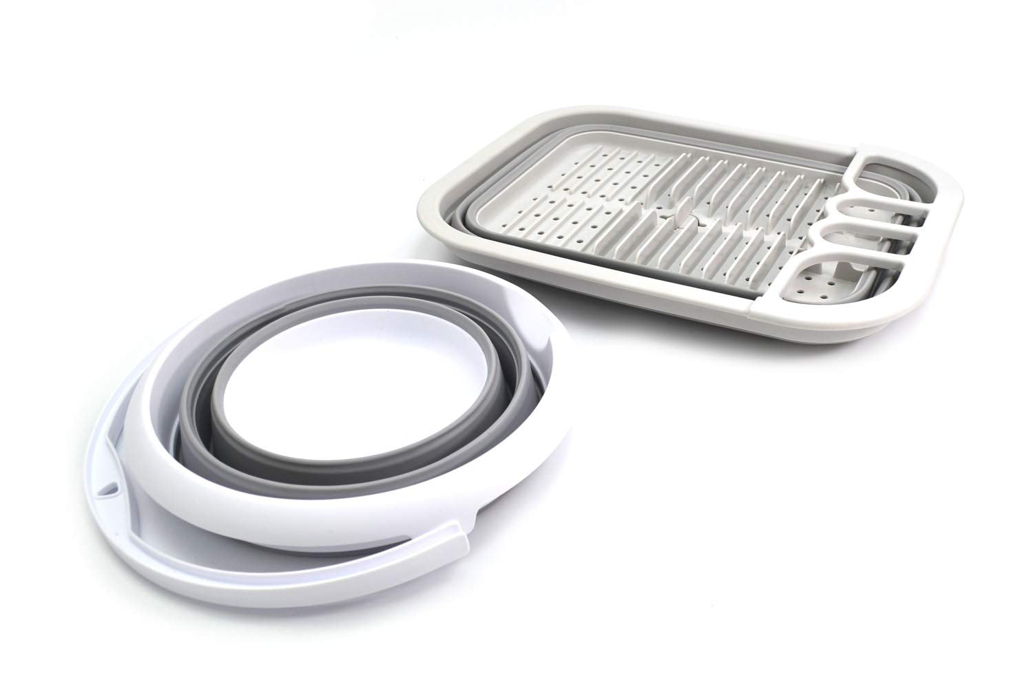 SAMMART 2pcs Kitchen & Outdoor Set : Collapsible Dish Drainer with Drainer Board & 5L Collapsible Plastic Bucket (2, Grey+Grey)