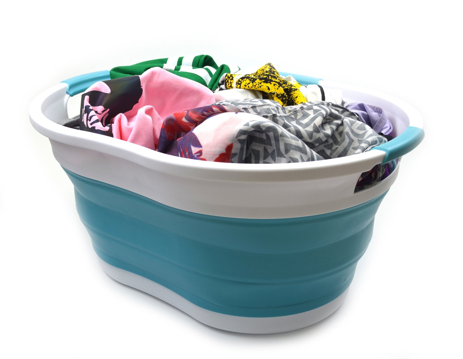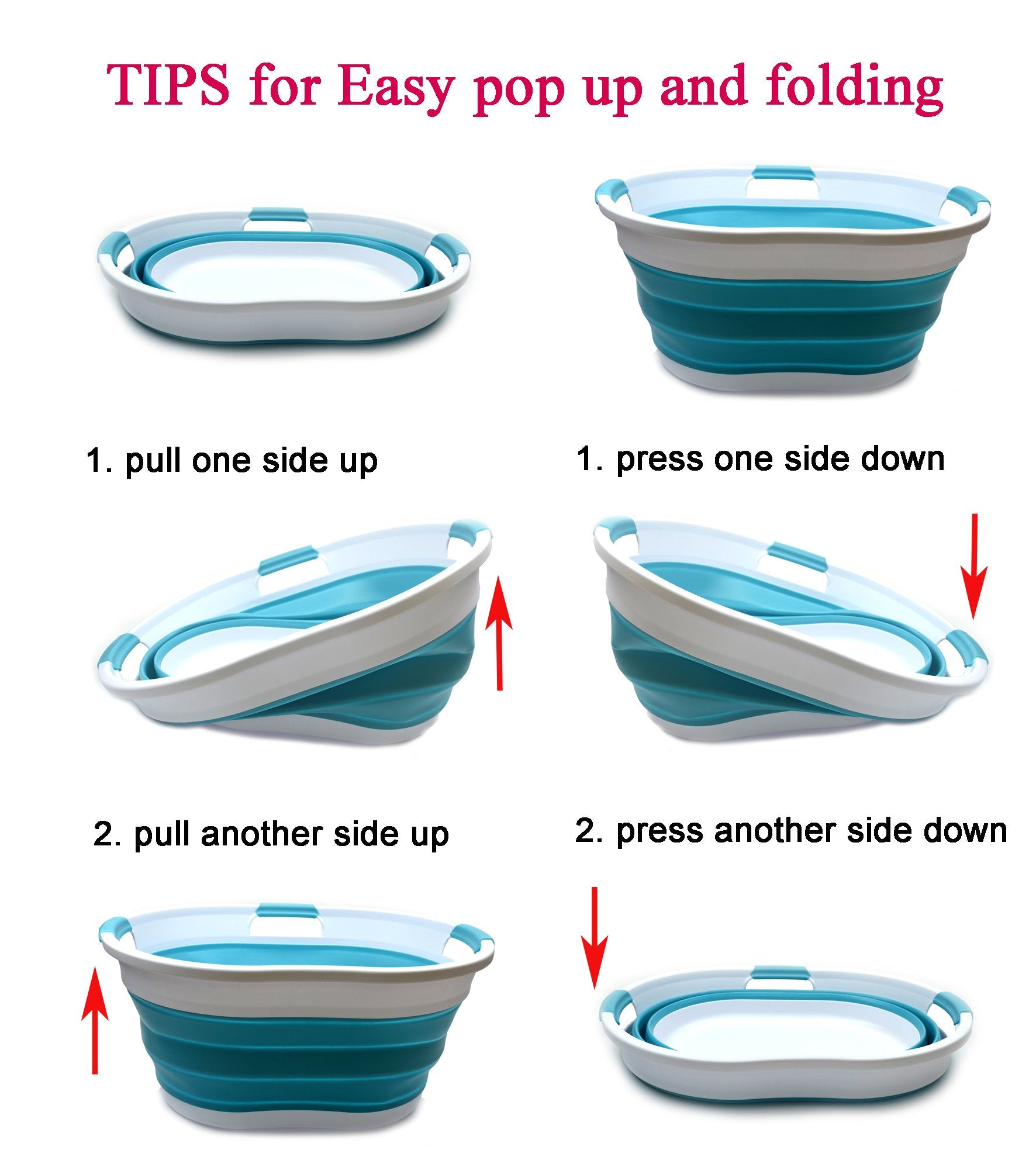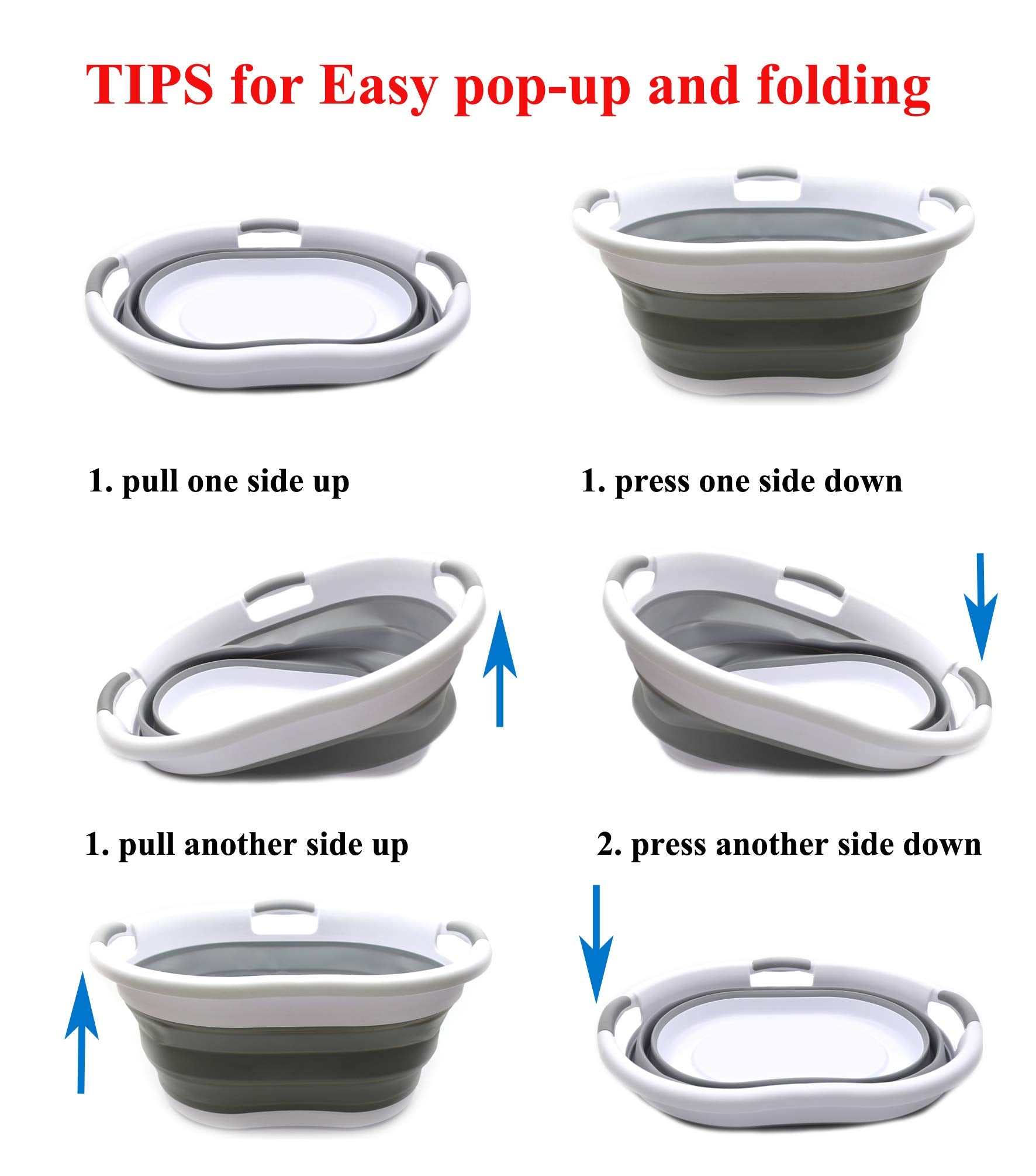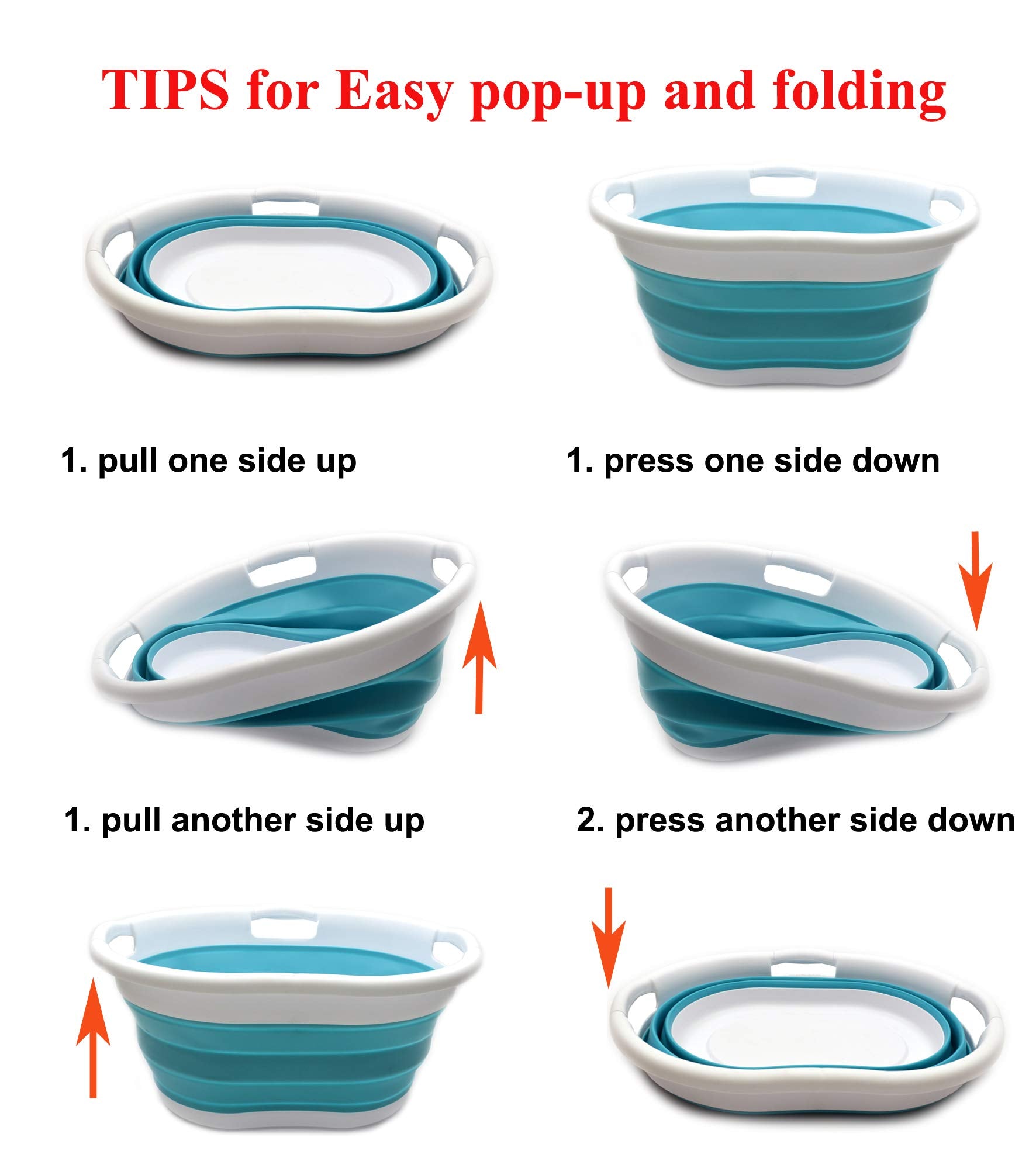 Details: **Collapsible TPE/PP Tub/Laundry Basket **Brand: SAMMART **Material: TPE & PP **Expanded size: 22.8 x 16.9 x 10.8 inches **Collapsed size: 22.8 x 16.9 x 3.4 inches **Full capacity : 36L (9.5 Gallon) **Water capacity: 27L (7.1 Gallon)