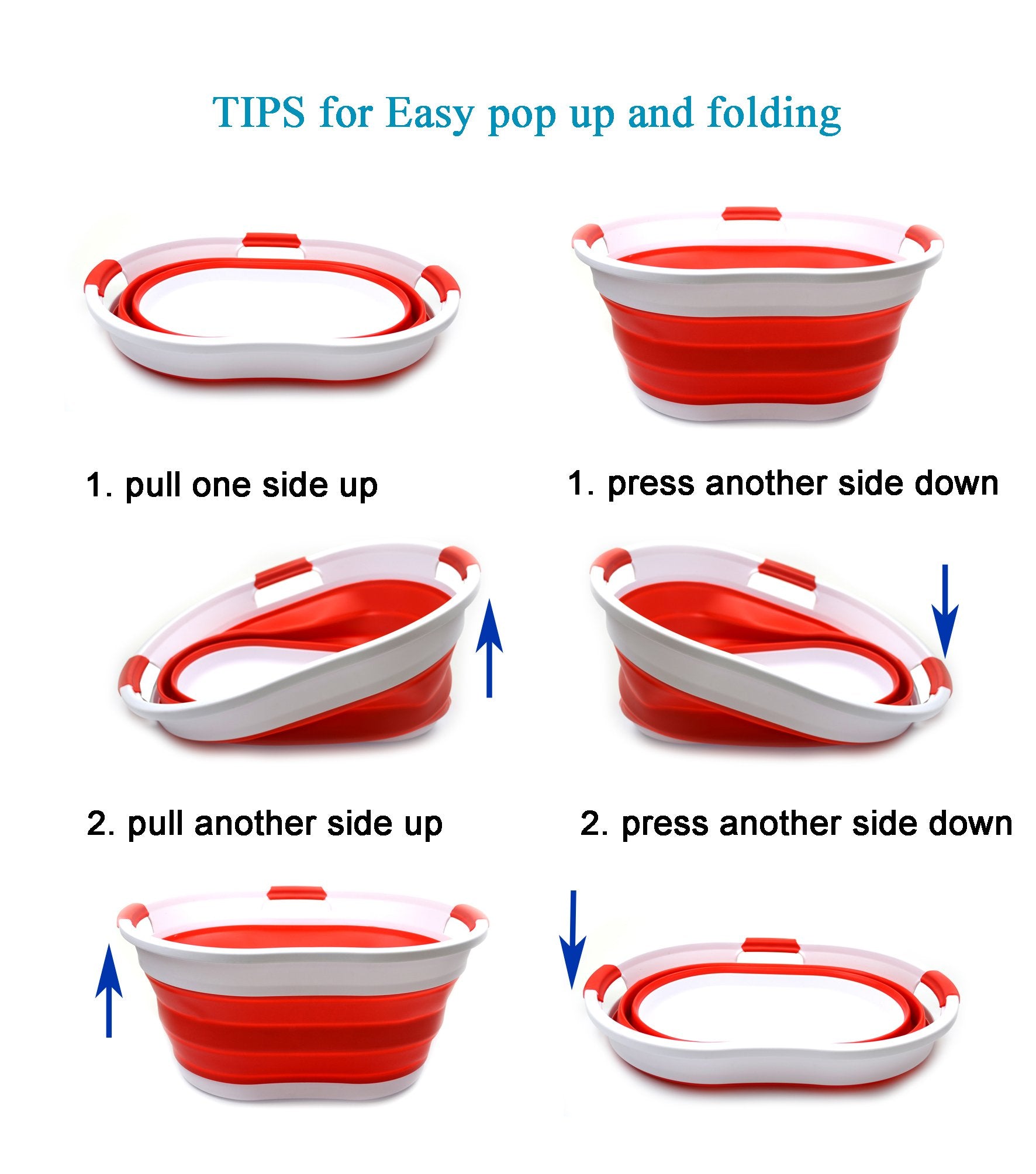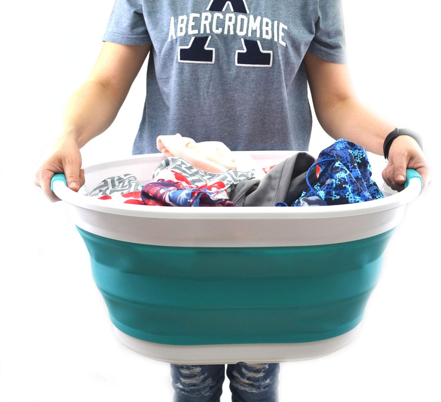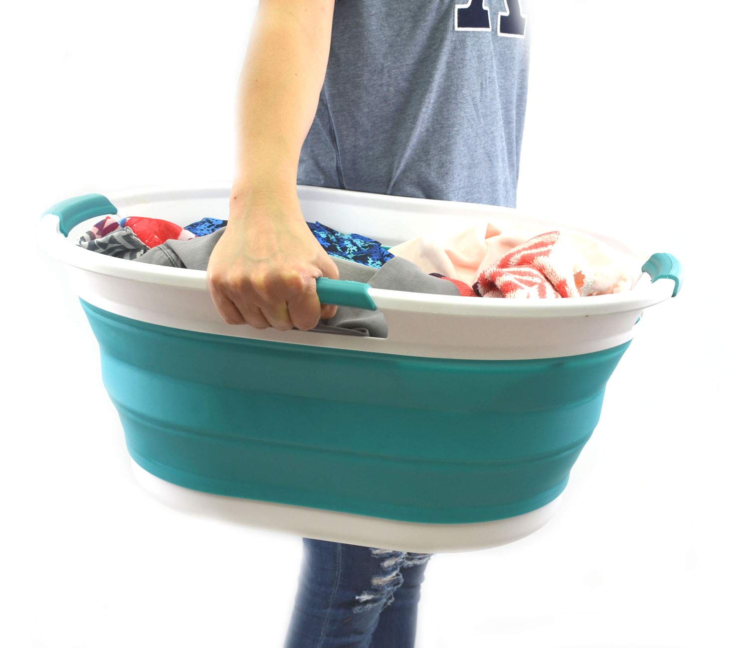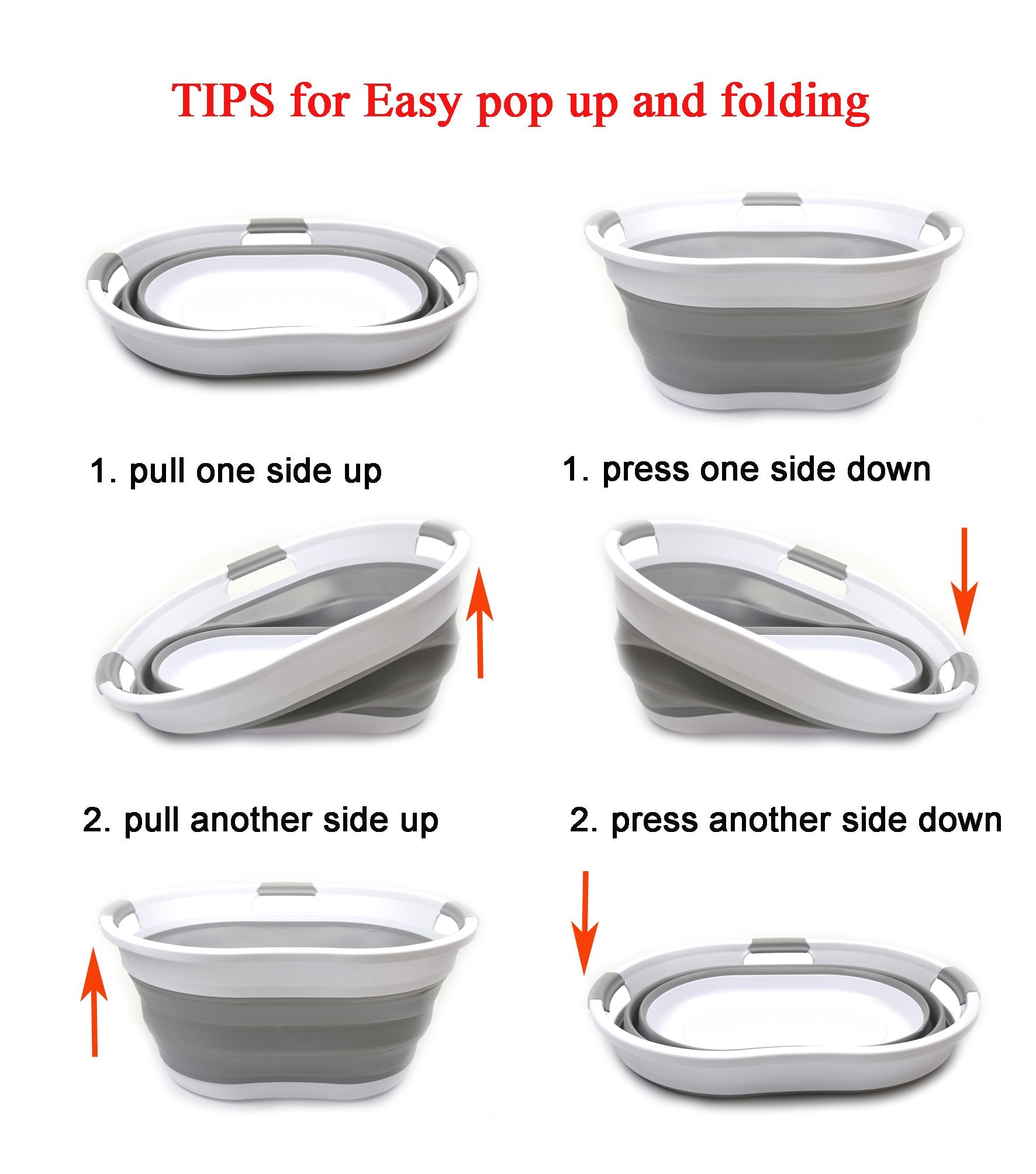 Details: **Collapsible TPE/PP Tub/Laundry Basket **Brand: SAMMART **Material: TPE & PP **Expanded size: 22.8 x 16.9 x 10.8 inches **Collapsed size: 22.8 x 16.9 x 3.4 inches **Full capacity : 36L (9.5 Gallon) **Water capacity: 27L (7.1 Gallon)