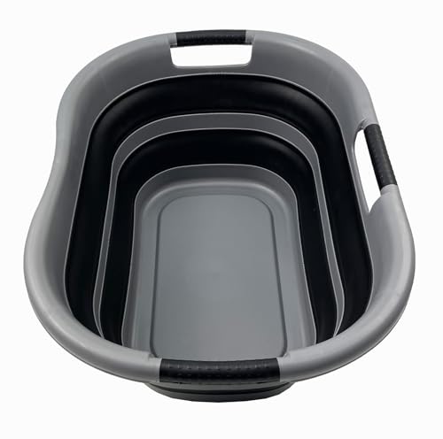 Details: "**Collapsible TPE/PP Oval Tub **Brand: SAMMART **Material: TPE & PP **Expanded size: 23.5 x 17.7 x 11 (h) inches **Collapsed size: 23.5 x 17.7 x 3 (h) inches"