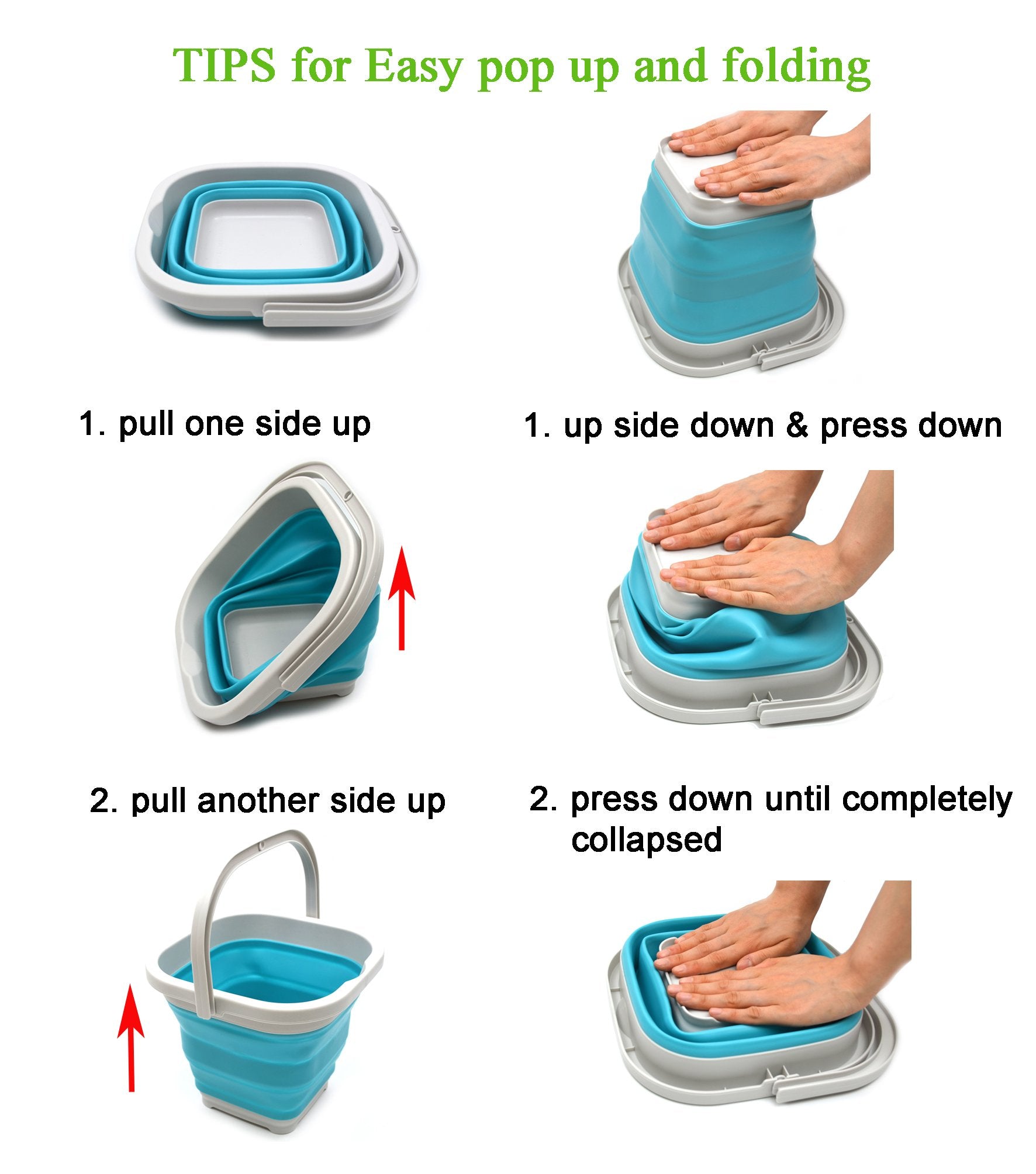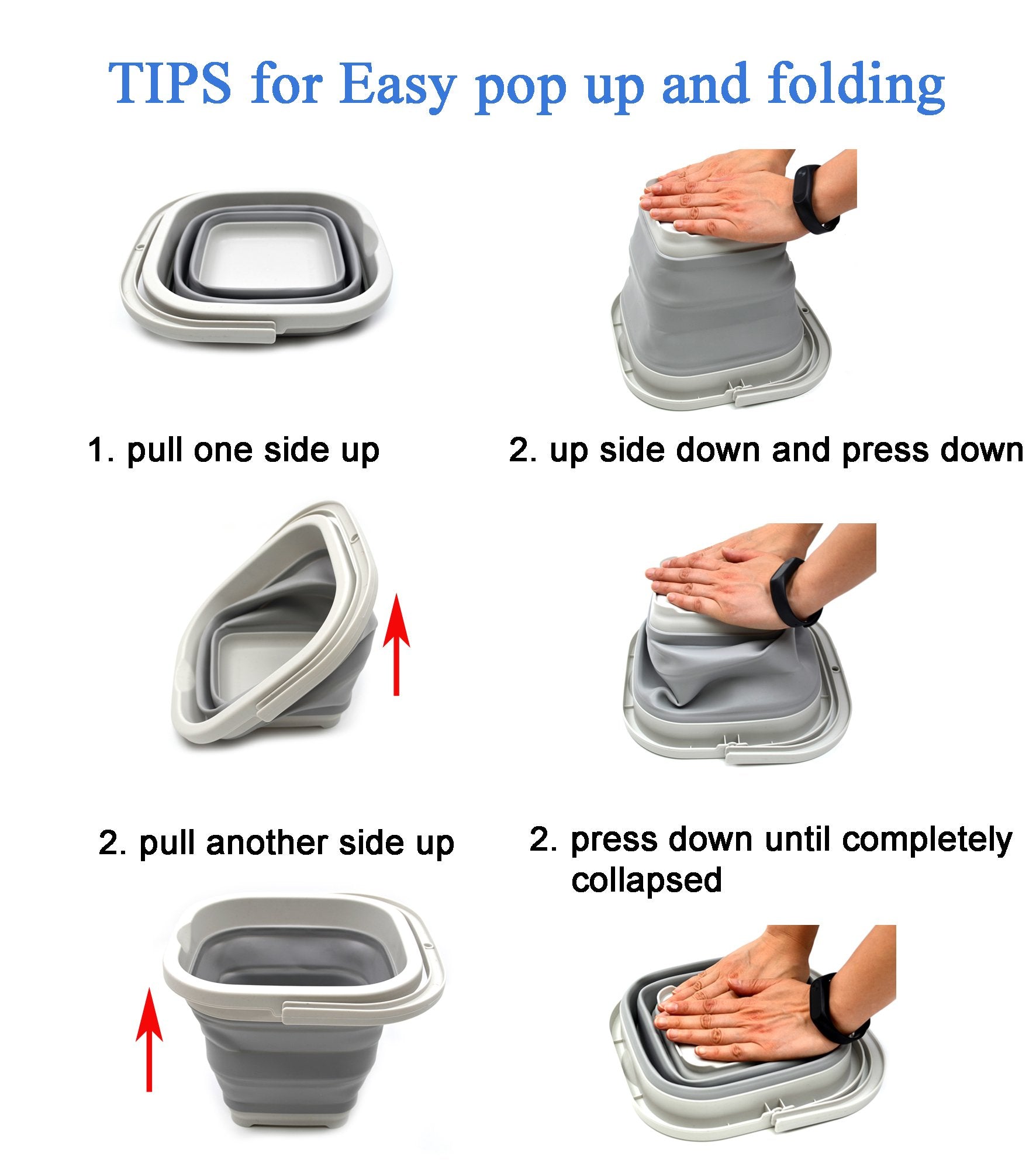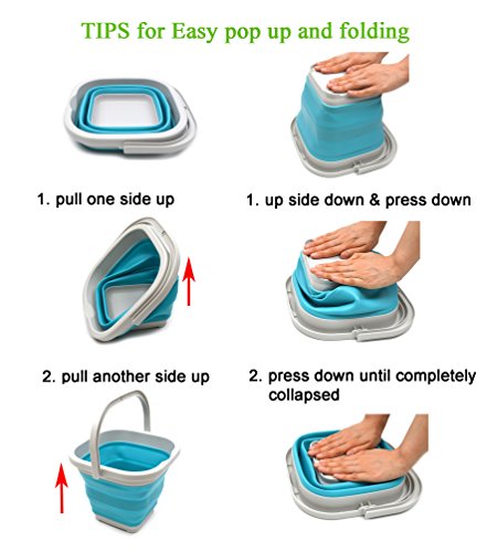- Space saving with Expanded size: 9.5 x 9.5 x 7.8(h) inches and its height just 2 inches after folds, save over 70% space when storage. Capacity: 5L (1.3 Gallon)