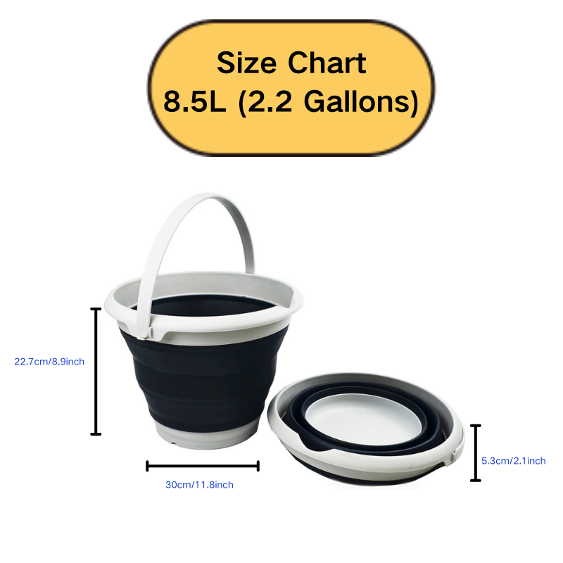 Details: **Collapsible TPE/PP Bucket **Brand: SAMMART **Material: TPE & PP **Expanded size: 11.8 (dia) x 8.9 (h) inches **Collapsed size: 11.8 (dia) x 2.1 (h) inches **Capacity: 8.5L (2.2 Gallon)