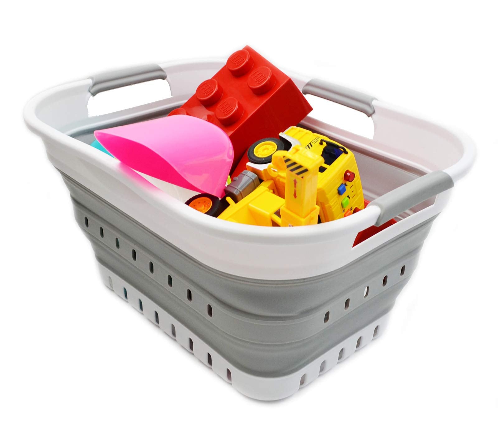 The SAMMART collapsible laundry basket in white and grey features a 19L capacity and BPA-free TPE/PP construction. It easily pops open for immediate use and folds flat for efficient storage. Equipped with comfortable grip handles, it offers convenient portability. This versatile basket functions well for organizing clothes, toys, or storing items in your car trunk, combining practical design with durable materials for everyday use.